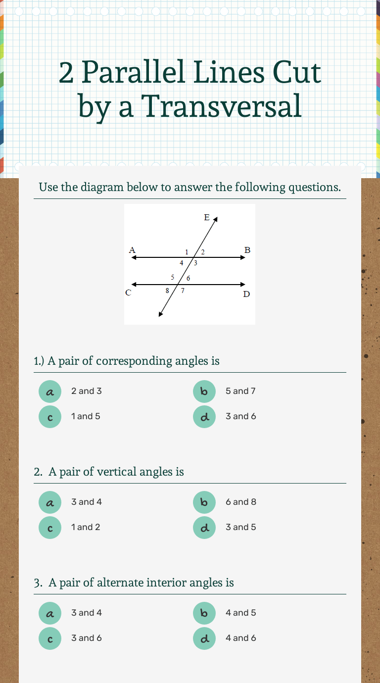 Parallel Lines Transversals 8th Grade Geometry Worksheets Angles Worksheet Geometry Worksheets Relationship Worksheets from i.pinimg.com Parallel lines and transversals worksheet . 9 10 11 12 d 13 14 15 16. Give a reason for each answer. • understand the parallel lines cut by a transversal theorem and it's converse. Using angle relationships and algebra to solve parallel line angle problems. Write all the angles from the given angles: Find your answer in the code key and notice the letter next to it. With these angle worksheets, you'll explore the angles formed by a transversals intersecting parallel lines.